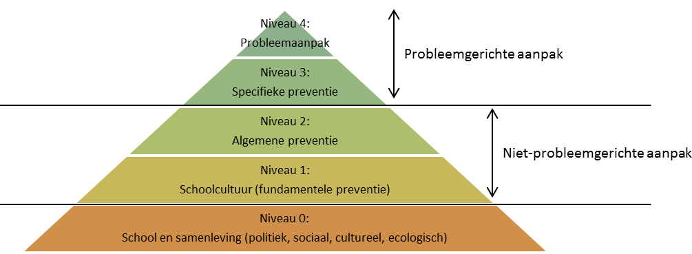 Wanneer we spreken over de schoolcultuur kunnen we dit niet loskoppelen van het schoolklimaat. In het werken aan een positief schoolklimaat waar leerlingen zich welkom, (h)erkend en veilig voelen kunnen acties ondernomen worden op verschillende niveaus. Hierbij gebruiken we de preventiepiramide van Johan Deklerck ( Deklerck, 2011 Deklerck, J. (2011). De preventiepiramide. Preventie van probleemgedrag in het onderwijs. Leuven: Acco. ). We kiezen voor dit model omdat deze de nadruk legt op preventie in plaats van het aanpakken van een probleem.